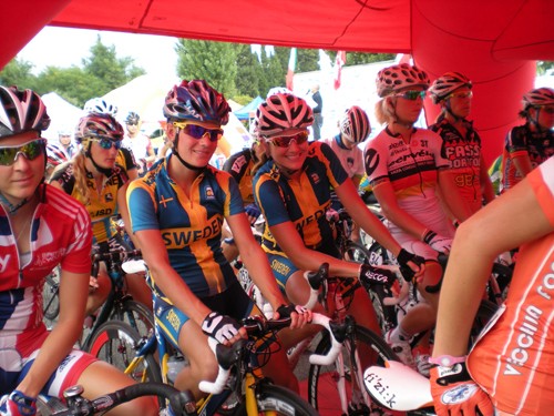 Dag 5 blev verkligen inte min dag.... Etappen började med att vi rullade en bit till kyrkogården där Michaela Fanini ligger begravd, den här tävlingen organiseras av hennes pappa och körs till minne av henne. Så efter en kortare minnesstund kom vi iväg. Vi skulle köra 4 varv som inkluderade en backe och sedan ett längre varv med en lite längre backe. Mitt i backen på varv 2 fick jag punktering, ett annat lags servicebil stannade och var snälla och gav mig ett hjul, bara det att det hjulet passade inte min cykel upptäckte jag efter ett tag när jag endast kunde köra på lättaste eller tyngsta växeln... Jag fick jaga ikapp vilket tog ett tag då jag inte kunde gå på karavanen, några andra tjejer hade tappat och då tillåter dom inte karavan-åkning. När vi kom ifatt gick det väldigt fort och jag fick slita en hel del. Fjärde gången uppför backen var tävlingen över för min del, jag tappade klungan och försökte länge att ansluta men ensam var det svårt, det blev 33 km helt ensam..... Inte alls kul.... Emma blev 3a på etappen - mycket bra kört!!!