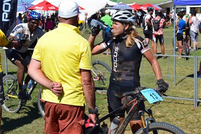 Klockan ringde kl 3.30 och vi gjorde oss klara för starten kl 6, jag var supernervös, vet inte riktigt varför. Det släppte när vi kom iväg. De första 20 kilometerna var på grusväg och vi satt i en klunga, när vi svängde av in på första stigpartiet så var det Candice (Sydafrikas OS cyklist i London), jag och Mariska (Cross country proffs) som var tillsammans. Jag fick en bra start på stigen men när vi kom till cross country banan så körde Mariska om mig och Candice gled iväg. Jag hade inte så mycket att sätta emot de två cross country specialisterna på det här partiet. Det var ca30 kilometerstig med en 5km grusvägsklättring mitt i. Jag körde på bra utan problem. På den sista klättringen som var på stig såg jag en liten Giant liggandes bredvid stigen, en sådan som Mariska kör. Hon hade fått magproblem så plötsligt var jag på andra plats, ovetande om det medan jag körde. Sista 20km var grusväg igen och det var bara att mata på.