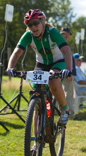 Vi drog iväg i ganska behagligt tempo uppför första grusbacken och in på första stigen blev det ett långt led, Angelica kom iväg några cyklister framför mig och jag körde om henne första gången vi körde över det tunga åkerpartiet vid varvningen. Jag fick en liten lucka men snart kom både hon och Emmy ikapp och vi 3 hade mer eller mindre sällskap i de första 24 kilometrarna. Vi hade några killar med oss vilket gjorde det svårt för någon att bryta sig loss, men när vi kom förbi första langningen och jag såg att Åsa inte var långt efter oss och jag kände att vi inte körde tillräckligt fort drog jag upp tempot i en uppförsbacke och Angelica släppte. Emmy och jag fortsatte tillsammans förbi nästa varvning. Det fanns ett riktigt tekniskt parti som jag inte klarade av att köra, vilket Emmy gjorde, hon fick en lucka på ca 200 meter på mig där vilket hon höll ett tag, till slut tog jag mig ikapp och kände att hon verkade lite trött. Så när vi kom till dagens brantaste backe gick jag om och la i en extra växel och kunde köra ifrån, jag fick snabbt en lucka på närmare 2 minuter.