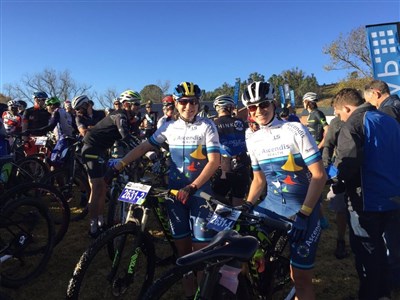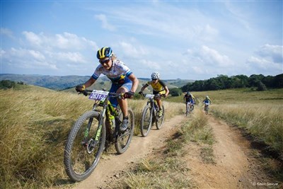 Jag flög till Johannesburg på tisdagen, sov över där och på onsdag morgon körde vi de 7 timmarna ner till Underberg tillsammans med Team Telkom, våra mekaniker och vår massör. Ryktet hade gått om hur kallt det skulle vara vid starten, morgonen innan hade de haft snö på bergstoppen! Som tur var så var det inte så kallt, hela +8gr och sol så det skulle bli en fin dag även om det var lerigt från tidigare dagars regn. Vi fick en bra start in på den första stigen och tog ledningen direkt, vi såg Candice och Vera lite då och då, vi visste att de skulle bli hårdaste motståndet. Tyvärr kom de ikapp oss runt 55 km och vi satt i en klunga tillsammans med dem. Robyn undrade om vi skulle stanna vit vätskekontrollen och jag tänkte att vi måste nog det om Robyn inte har något vatten kvar, så vi stannade. Det visade sig vara dumt då ingen annan stannade och vi var ca 30 sekunder efter när vi lämnade kontrollen, vi var ensamma och de i en klunga så vi fick slita otroligt hårt för att komma ikapp, vilket vi gjorde endast 3 km från mål. Vi vann etappen med 15 sekunder!