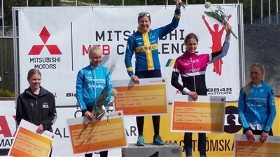 På tävlingsdagen var det 9 grader och duggregn när jag skulle cykla hemifrån för att värma upp till Lugnet, nu var jag ju van att klä på mig alla regnkläder så det var bara att kliva ut. Det kändes kallt att ta av sig till kortbyxor i det vädret! Som tur var så var det uppehåll när vi tjejer startade kl 10. Det var första gången jag körde en tävling i Sverige med separat damstart och vilken skillnad det var! Det blir en helt annan tävling när vi får tävla med och mot varandra istället för med killarna där vi bara försvinner. Redan i startbacken blev vi en grupp på 5 tjejer som kom loss och vi följdes åt på de inledande öppna grusvägarna. Någonstans runt mitten av första loopen tappade vi en tjej och snart en till och det skulle stå mellan mig, Ida Jansson och Isabelle Söderberg. Jag visste att jag var tvungen att gå först in i den nya Flow-stigen på Lugnet för att ha chans på spurtpriset vilket var vid varvningen efter första loopen. Jag gick fram och drog långt innan men visste at det var svårt att komma om så jag var nöjd med att dra. Min plan fungerade bra och jag kunde ta hem spurtpriset. Ut på andra loopen var vi alla 3 fram lite då och då och drog, plötsligt när vi gick in i en brant backe försvann Isabelle, jag blev lite förvånad över det och samtidigt var Ida grymt stark och jag fick bita i för att hänga med. I ett gyttjehål kom hon av cykeln och jag lyckades hålla mig på och kunde köra om, jag fick en lucka men visste att hon skulle köra ikapp så jag stressade inte för mycket. Vi gick tillsammans ut på 3e loopen och jag hade en liten svacka ett tag där jag fick bita i ordentligt för att sitta med. I ett annat gyttjehål kom vi båda av cykeln och Ida kom iväg snabbare än mig så hon fick en lucka och jag fick jaga, jag kom ikapp och hittade ny energi mot slutet av tävlingen. Jag kände att jag hade ett övertag på det tekniska och speciellt utför så jag bestämde mig för att gå först in på den sista handgrävda stigen från toppen av backen, efter det var det i stort sett bara nedför till mål och en del stig vilken var svår att köra om på. Jag höll mig till min plan och fick snabbt en lucka utför. Det var bara att köra allt jag hade och det var skönt att komma mot målet utan att behöva spurta och hinna fira segern innan linjen!