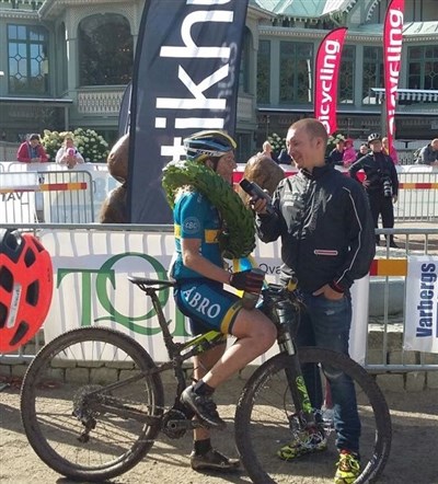 Jag trodde det skulle vara torrare än tidigare år men allt var sig likt och det var toklerigt ute i skogen, det hade regnat mycket kvällen innan och halvvägs genom loppet kom det en skur till. Under uppvärmningen märkte jag att något inte stod rätt till med mina växlar, vid de tyngsta växlarna ville det inte riktigt fungera och jag hoppades bara att det skulle fungera under tävlingen. Vi startade med herrarna och det gick fort när vi precis hade lämnat Varberg, min tyngsta växel ville inte hoppa i så jag satt med en otroligt hög kadens och hade stora problem med att hänga med killarna på platten. När vi kom ut i skogen gick det bättre då tyngsta växeln ändå inte skulle användas men ibland ville det inte växla alls oavsett vilken växel jag hade. Jag kom ifrån de övriga tjejerna tidigt och hamnade i en liten klunga på ca 4-5 killar och lyckades köra med dem ungefär halva loppet. Inne på ett riktigt lerigt parti sprack den lilla klungan upp och en bit senare halkade jag till och for rakt in i en buske, det tog en stund att komma upp och få ordning på cykeln och då var alla borta och jag var helt ensam med 40 km kvar. Det är ibland svårt att motivera sig att trycka på precis allt man har när man inte ser någon annan tävlande så jag blev lite besviken när jag tittade bak med ca 10km kvar och ser en stor herrklunga närma sig snabbt! Jag blev förstås lite rädd att de andra tjejerna skulle sitta med där. Jag hade tur att det inte var någon tjej med där och kunde ta det lugnt de sista kilometrarna mot mål för att ta emot segerkransen!